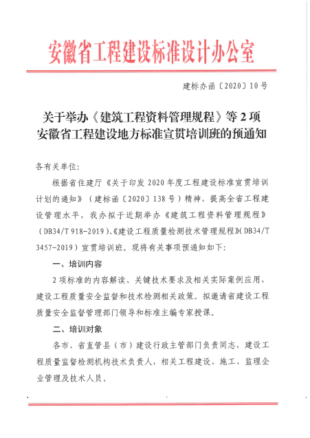 關于舉辦《建筑工程資料管理規(guī)程》等2項安徽省工程建設地方標準宣貫培訓班的預通知