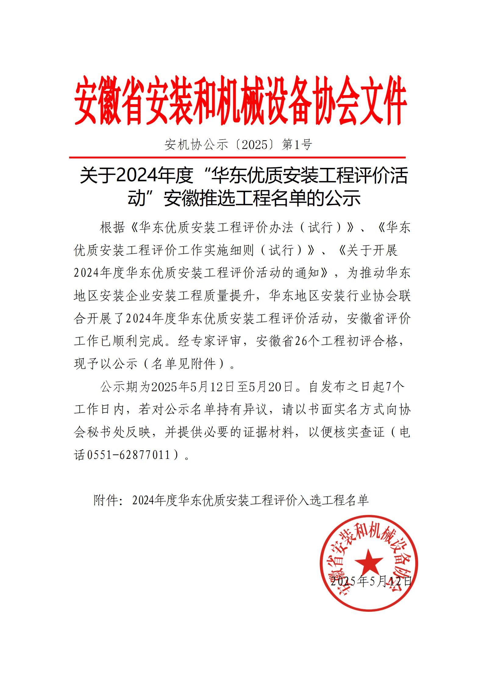 關(guān)于2024年度“華東優(yōu)質(zhì)安裝工程評價活動”安徽推選工程名單的公示