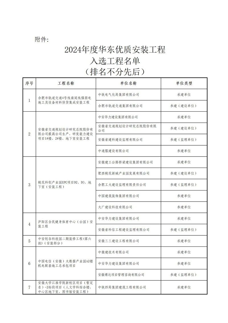 關(guān)于2024年度華東優(yōu)質(zhì)安裝工程評價結(jié)果的公示