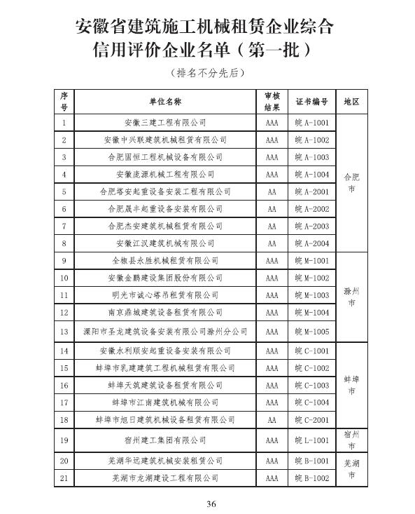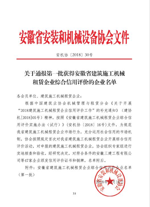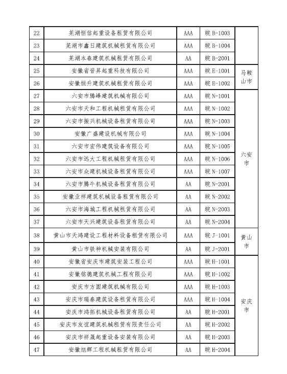 安徽省安裝和機械設(shè)備協(xié)會關(guān)于通報第一批獲得安徽省建筑施工機械 租賃企業(yè)綜合信用評價的企業(yè)名單